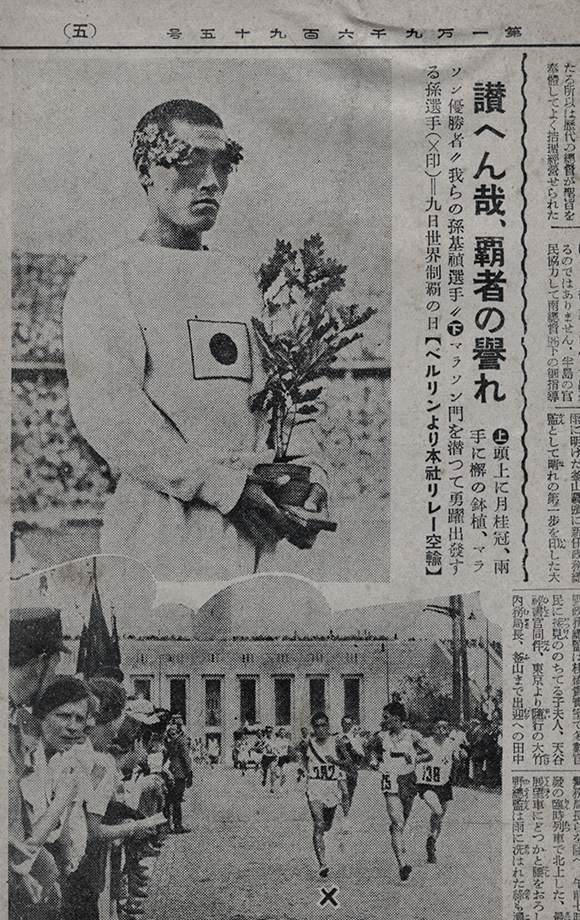 1936년 베를린 올림픽에서는 '기타스'라는 이름으로 일본 대표로 출전했습니다. 그는 마라톤에서 2시간 29분 19.2초의 기록으로 1위를 차지했지만, 일본 국기 아래서 수상했습니다. 조선인이지만 일본국기를 달고 시상대에 올라간 손기정은 일장기를 월계수로 가렸고 일본 국가를 들으면서 깊은 슬픔을 느꼈습니다. 하지만 외국언론사와의 인터뷰에서는 당당히 자신이 조선인임을 당당히 알렸습니다. 또한 그의 일장기를 달고 우승한 그의 모습과 올림픽 마라톤 대회에서 1등을 한 사람이 조선인이라는 사실은 국내에서도 많은 관심과 애국심을 일으켰습니다. 신문사들은 손기정의 우승 사진에서 일장기를 지워버리거나 흐리게 표현했고, 이 때문에 일제는 일부 신문사를 폐쇄하였습니다.