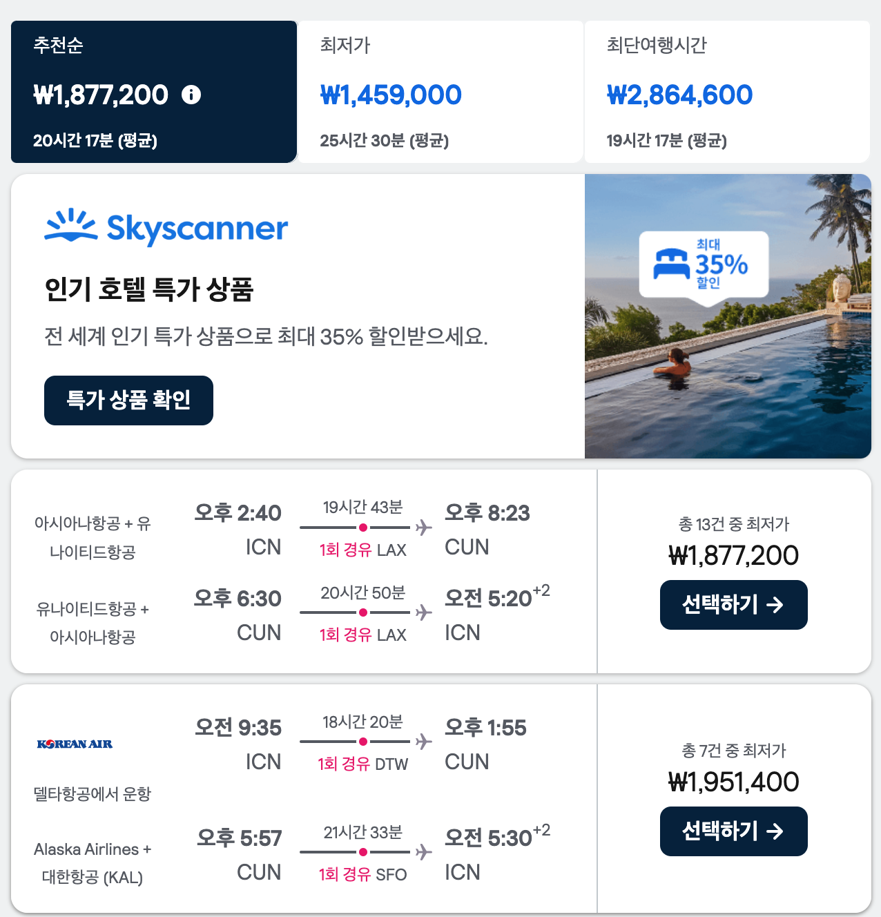 - 인천국제공항에서 칸쿤 국제공항까지는 직항으로 운행하는 항공사가 없습니다. 대한항공, 아시아나항공은 미국을 경유하여 도착합니다. 소요시간은 약 14시간 30분입니다.
